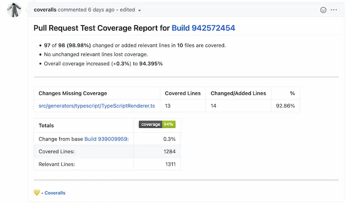 Jonas Lagoni that actively maintains the library gave Coveralls a score of 8 out of 10. Now we need to roll it out to other projects. If you were looking for some good first issue to start contributing to AsyncAPI, then this issue is a good one.